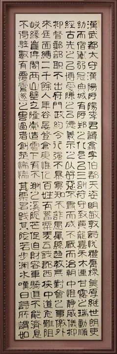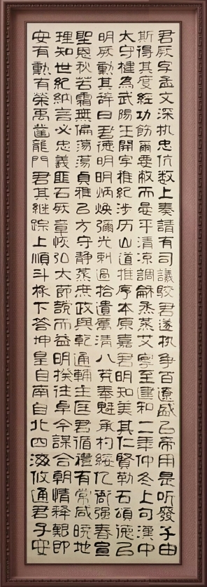 书作既有《西狭颂》的金石骨力,又具武者的爽利气度,字里行间可见“笔为剑、墨为锋”的文武相融之境,既守传统法度,又以武韵赋能笔墨,形质与神采兼备,尽显中华文武同宗的文化底蕴。从书体上看,他的楷书、隶书,特别是小楷,个性风格渐显。行草书则一气呵成,笔酣墨畅,大气淋漓,展现出斩钉截铁的气势。其作品整体结构端庄,行笔大气,笔法干练,中宫严谨,结构舒展,用笔凝重,有从险绝回归平整的奇趣。